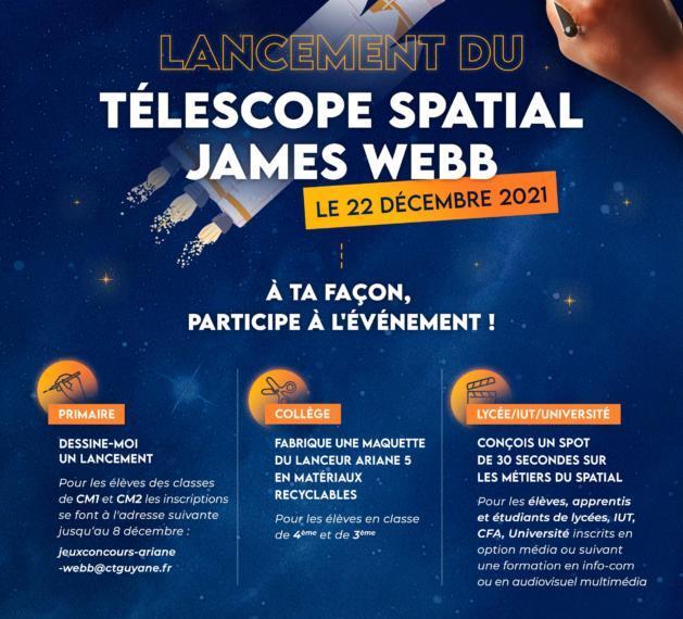 Dans le cadre du lancement du télescope américain James Webb, prévu le 22 décembre prochain, la Collectivité Territoriale de Guyane (CTG), le CNES, la Région Académique Guyane, le Campus des métiers et des qualifications aéronautiques et spatial Guyane, l’IUT de Kourou et la Poste organisent 3 jeux-concours à destination des élèves et étudiants du territoire afin de sensibiliser sur cette actualité inédite et de permettre à chacun d’exprimer son talent.