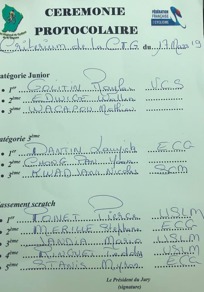 C’est donc Ponet Pierce qui a tiré son épingle du jeu et s’est imposé devant Stéphane Merryl de l’Espoir Cycliste Guyanais; Mario Jandia et Teddy Ringuet de l’USLM.