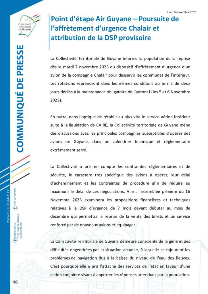 En outre, dans l’optique de rétablir au plus vite le service aérien intérieur suite à la liquidation de CAIRE, la Collectivité territoriale de Guyane mène des discussions avec les principales compagnies susceptibles d’opérer des avions en Guyane, dans un calendrier technique et réglementaire extrêmement serré.