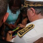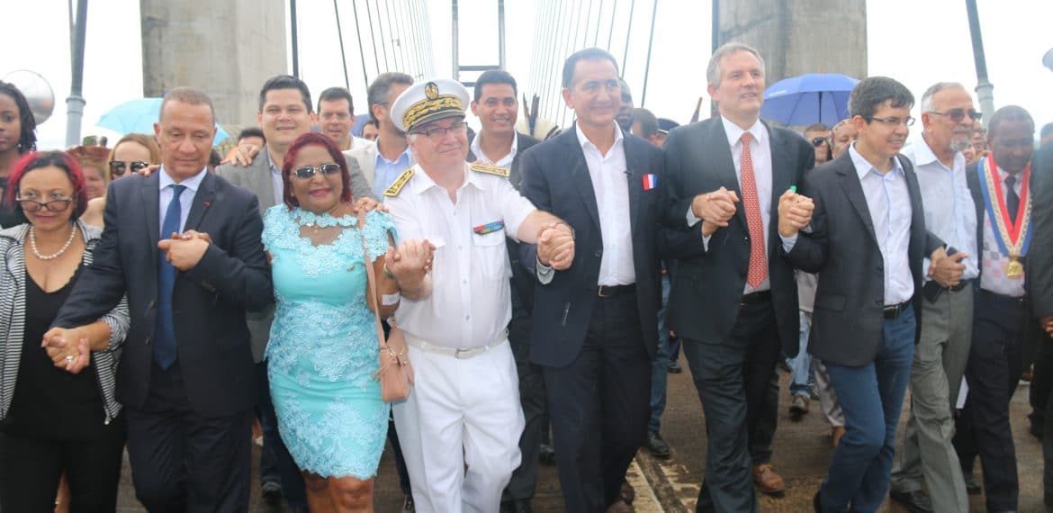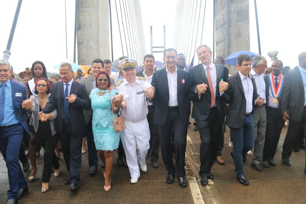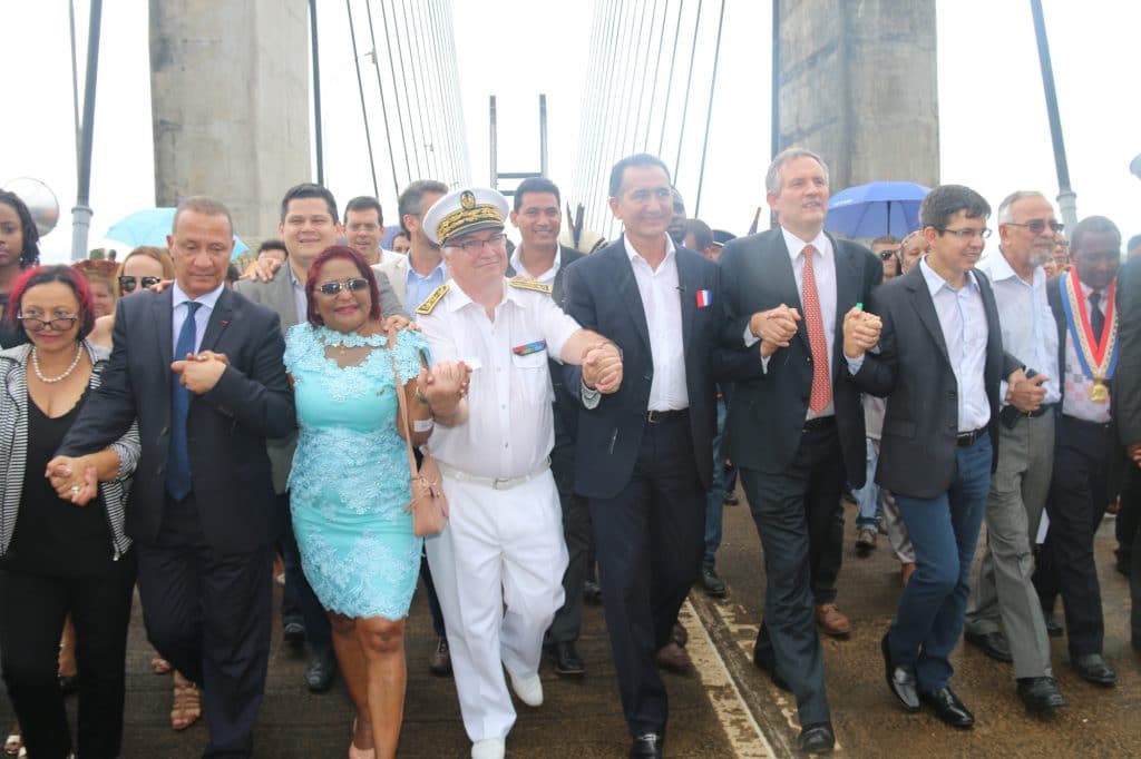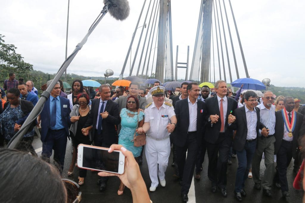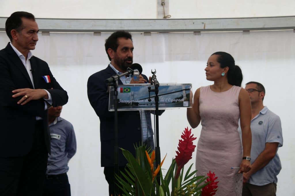 Il était 11 h 45, ce samedi 18 mars 2017, quand les officiels français ont commencé à se diriger d’un pas cadencé vers le chapiteau dressé pour l’occasion à l’exact milieu du pont. Ils y étaient attendus par leurs homologues brésiliens. Quelques mètres plus tard, politiques français et brésiliens se retrouvaient face à face. Accolades et poignées de main chaleureuses ont rythmé ce moment. Seul le ruban séparait pour quelques minutes encore les deux côtés, le temps que les hymnes brésiliens et français retentissent et soient entonnés avec ferveur. Arrivé le moment symbolique du coupé de ruban, l’émotion était au rendez-vous côté français comme brésilien. Des morceaux de ruban aux couleurs des deux pays ont été distribués à la population présente. Tous voulaient repartir avec ce petit bout de l’histoire.