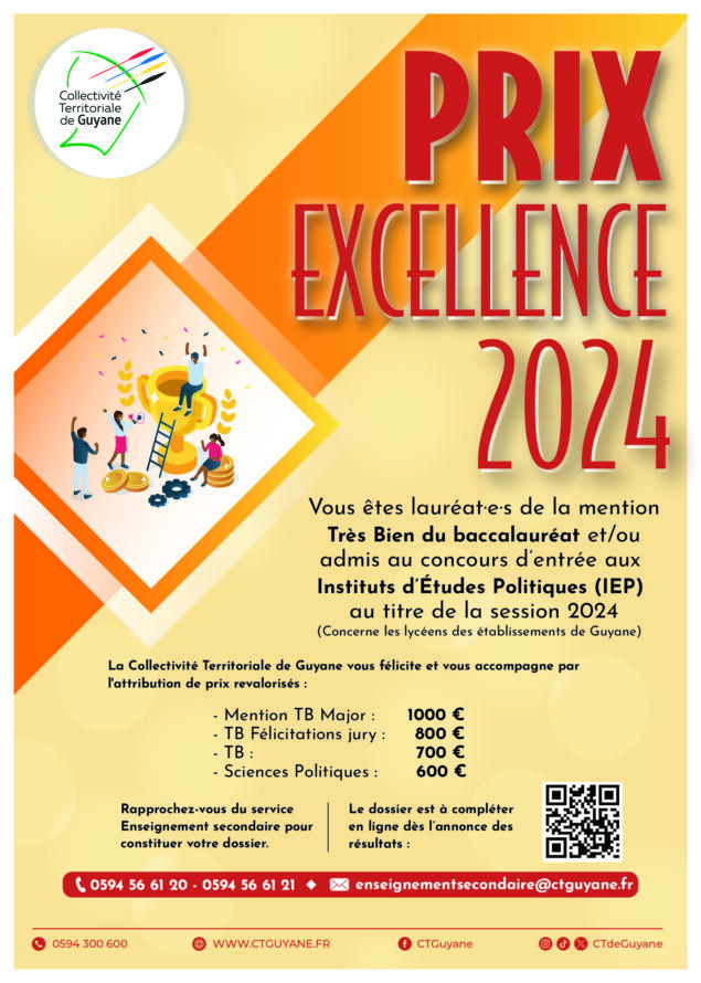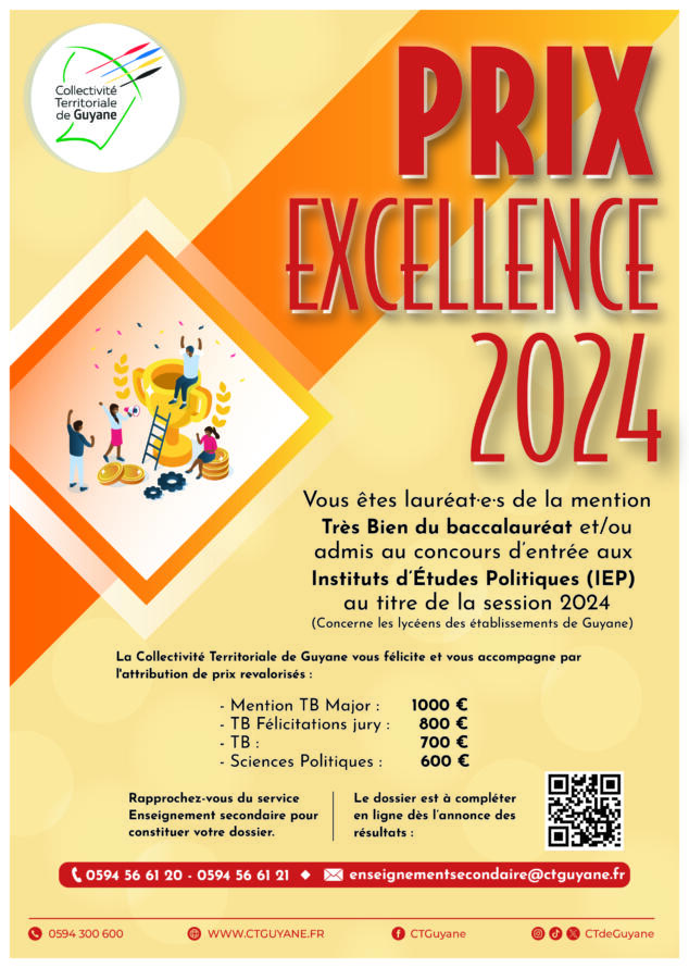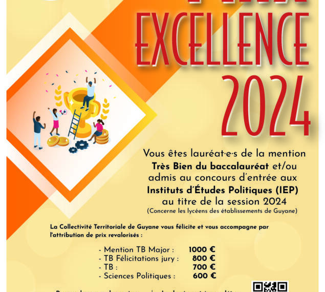 La Collectivité Territoriale de Guyane récompense les bacheliers de Guyane ayant obtenu la mention très bien et ceux admis au concours d’entrée aux Instituts d’Études Politiques, à travers une aide financière. Ces bacheliers seront également mis à l’honneur lors d’une cérémonie de remise des prix qui se déroulera le mercredi 17 juillet 2024, de 9h à 13h à l’auditorium de l’Encre, à Cayenne.