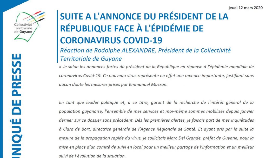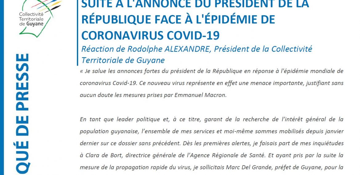 Réaction de Rodolphe Alexandre, président de la Collectivité Territoriale de Guyane, suite à l’annonce du président de la République face à l’épidémie de coronavirus Covid-19