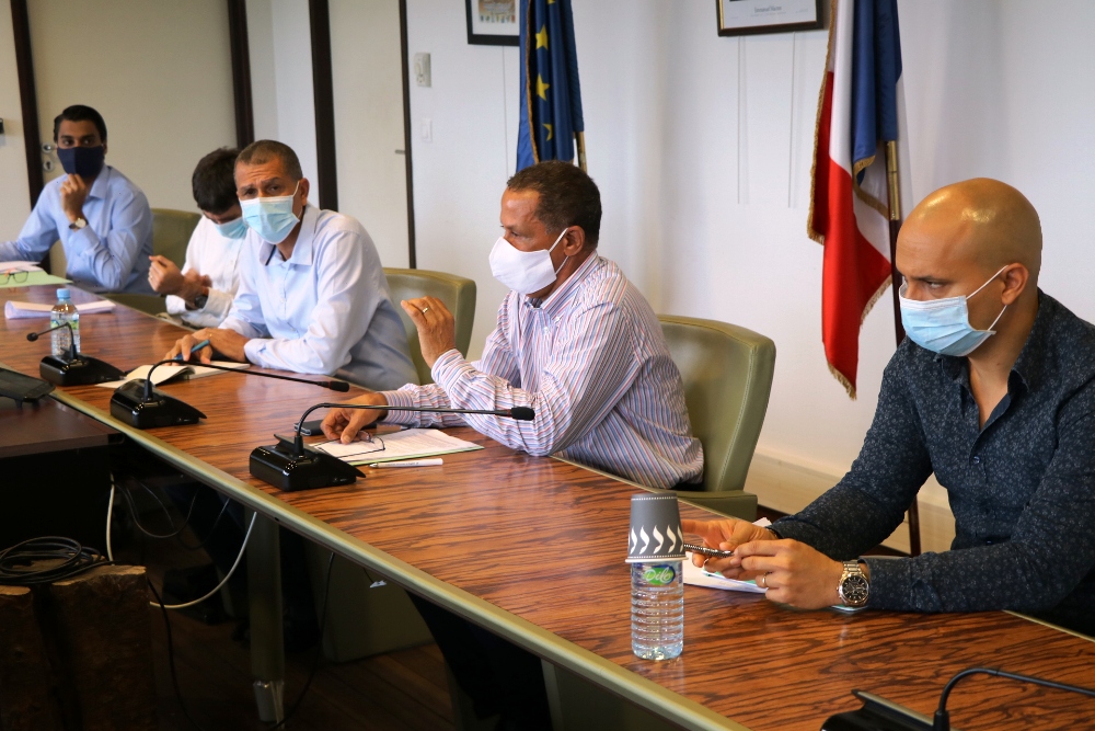 Dans le cadre du déconfinement et du retour progressif à l’école annoncés, Rodolphe Alexandre, président de la Collectivité Territoriale de Guyane, accompagné de Claude Plénet, Vice-Président délégué à l’Education, l’Apprentissage et la Formation professionnelle, recevait ce lundi 27 avril 2020 les représentants des organisations syndicales des enseignants : SE-UNSA (Syndicat des Enseignants de l’Unsa), AEI (Administration et Intendance) et SNPDEN (Syndicat National des Personnels de Direction de l’Education Nationale) ainsi que la FAPEEG (Fédération Autonome des Parents d’Elèves et Etudiants de Guyane). Participait également à cette réunion en audioconférence Isabelle Patient, vice-présidente de la CTG, déléguée à l’Aménagement du Territoire, au Logement et au Transport.