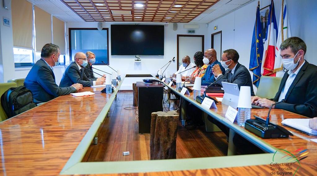 Ce mercredi 15 septembre 2021, Gabriel Serville, président de la Collectivité Territoriale de Guyane, rencontrait Thierry Muller, directeur général de Total Énergies Renouvelables, en présence d’Anna Lafont, directrice Antilles-Guyane de Total Énergies Renouvelables et d’Olivier Wattez, responsable développement Guyane de Total Énergies Renouvelables;