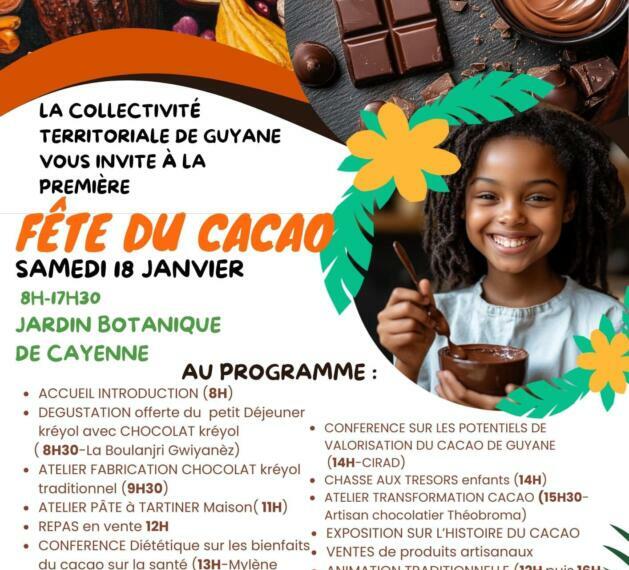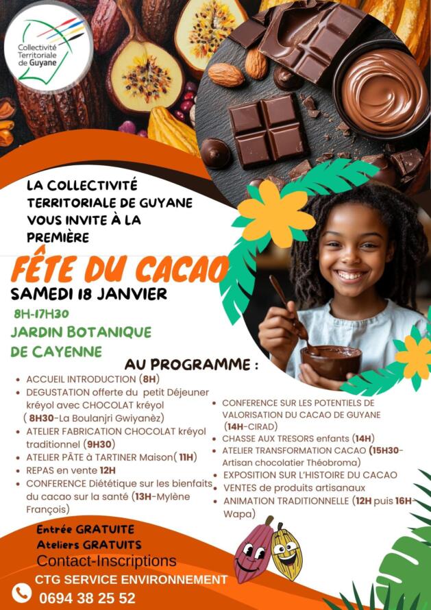 Le CACAO est une plante d’Amazonie, aux potentiels riches, la Guyane dispose d’ailleurs d’une variété unique et aux propriétés rares, à ce titre, et afin de mettre en lumière ce produit d’exception, la Collectivité Territoriale de Guyane organise la 1ère édition de la fête du Cacao le samedi 18 janvier 2025, de 8h à 17h30 au jardin botanique.