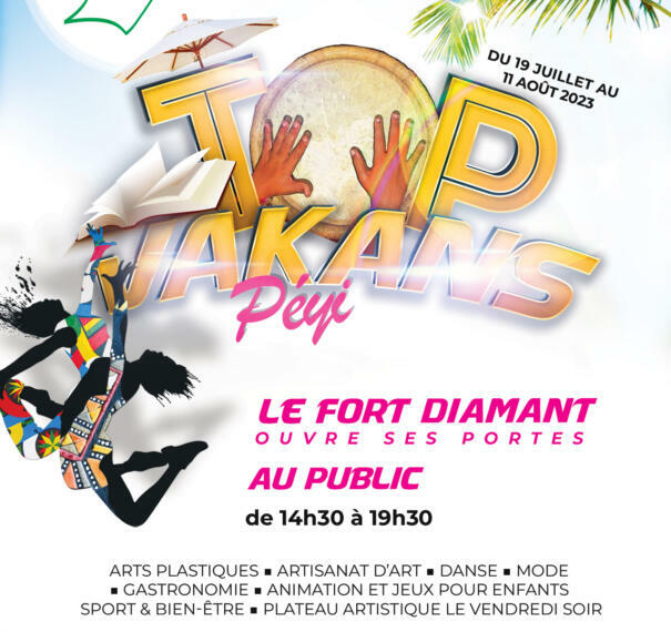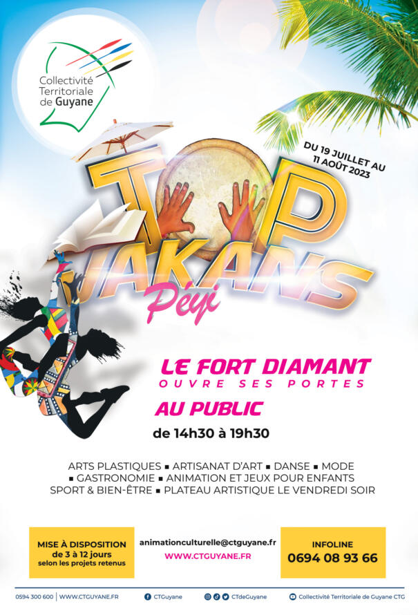L’opération TOP VAKANS PEYI organisée par la Collectivité Territoriale de Guyane (CTG) revient du mercredi 19 juillet 2023 au vendredi 11 août 2023 au Fort Diamant. Ce rendez-vous estival vise à offrir au public et notamment à la jeunesse, un programme d’activités riche et diversifié. Ateliers artistiques, danse, mode, sport et bien-être, gastronomie, vente de produits naturels, animations en plein air, jalonneront ces journées dédiées au public.