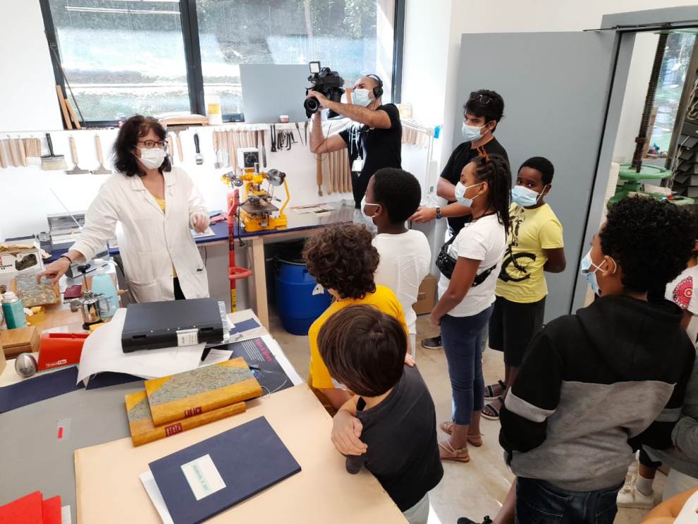 La matinée a débuté par une séance vidéo sur les techniques de la conception de la reliure, suivie d’une visite des différents ateliers, avant de se poursuivre au service éducatif pour la confection de carnets de mémoire.