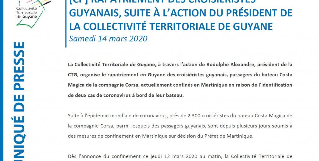 [COMMUNIQUE] Retour en Guyane des croisiéristes guyanais, suite à l’action du président de la Collectivité Territoriale de Guyane
