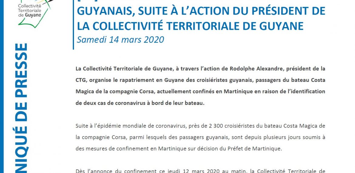 La Collectivité Territoriale de Guyane, à travers l’action de Rodolphe Alexandre, président de la CTG, organise le retour en Guyane des croisiéristes guyanais, passagers du bateau Costa Magica de la compagnie Corsa, actuellement confinés en Martinique en raison de l’identification de deux cas de coronavirus à bord de leur bateau.