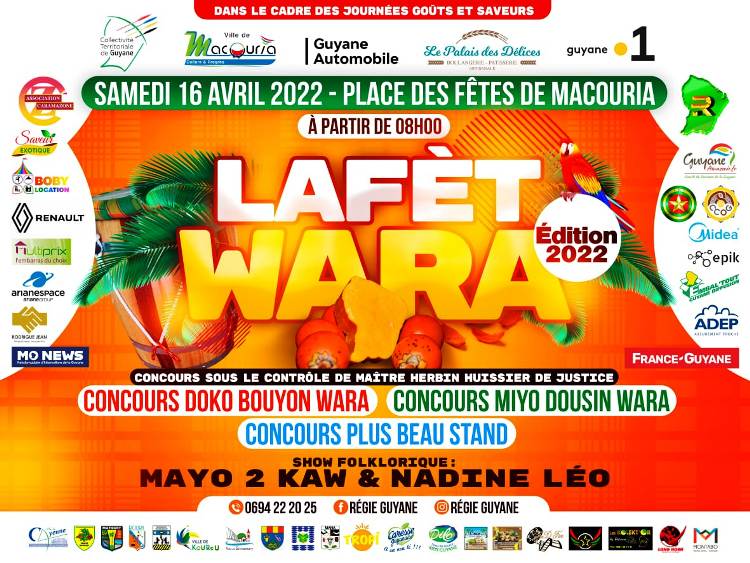 Le samedi 16 avril 2022 se déroulait, à la Place des fêtes de Macouria, l’évènement « Lafet wara », proposé par l’association Caramazone et Régie Guyane avec le partenariat de la ville de Macouria et de la Collectivité Territoriale de Guyane, dans le cadre des Journées Goûts et Saveurs de Guyane 2022.