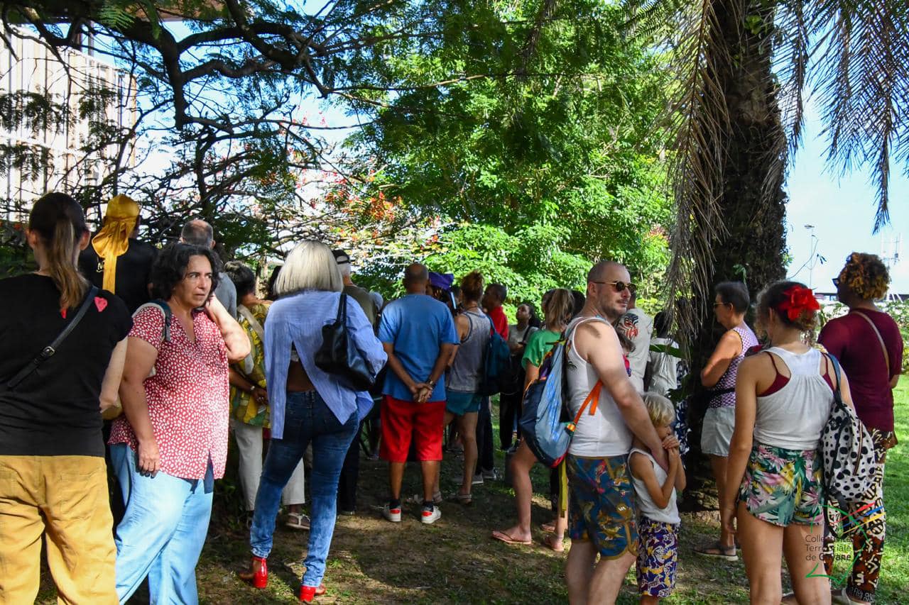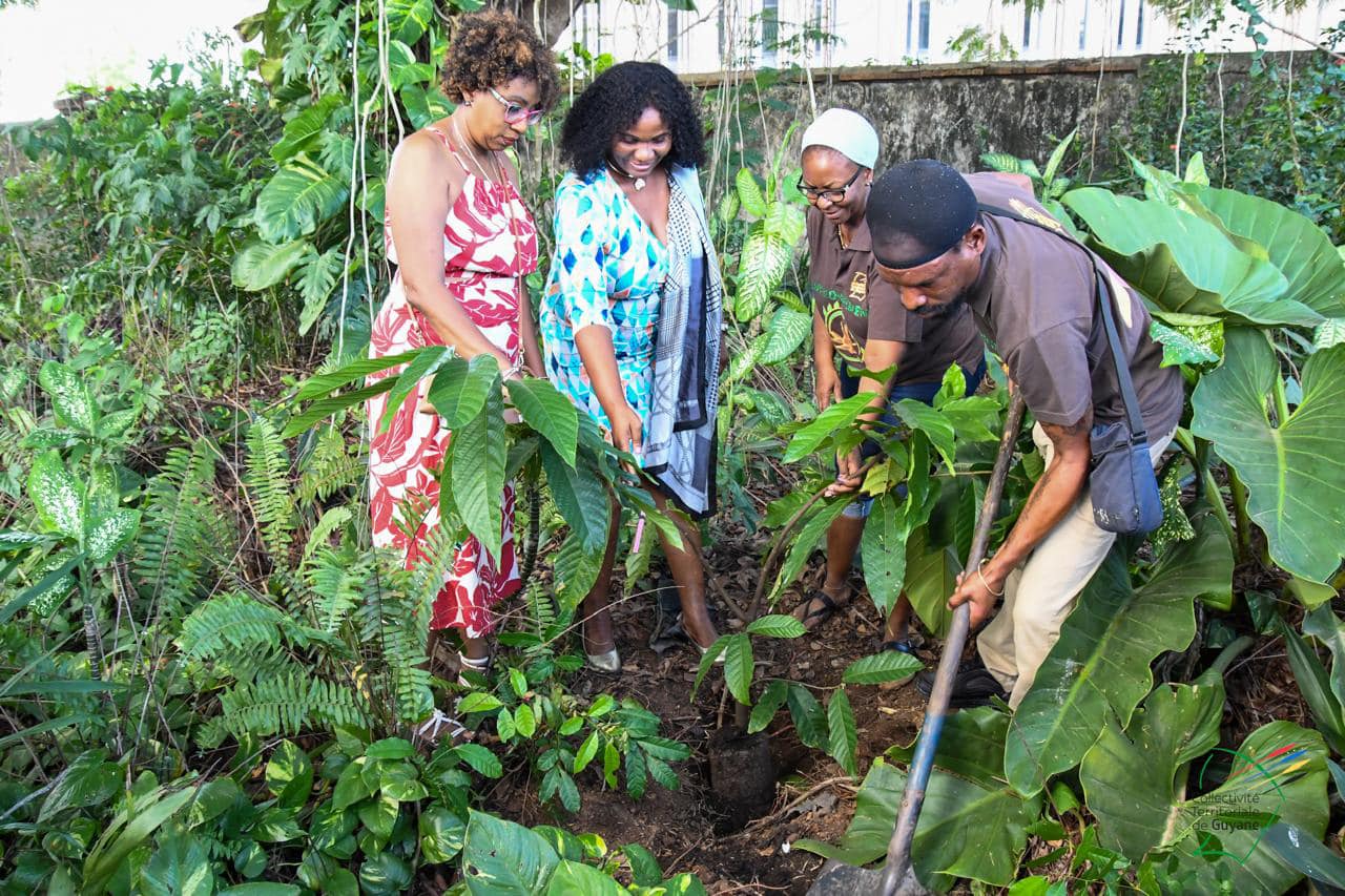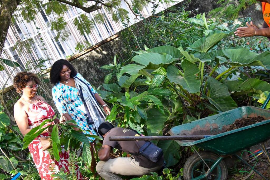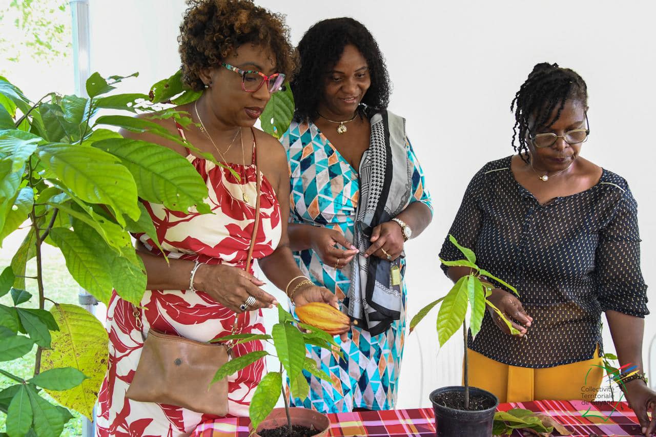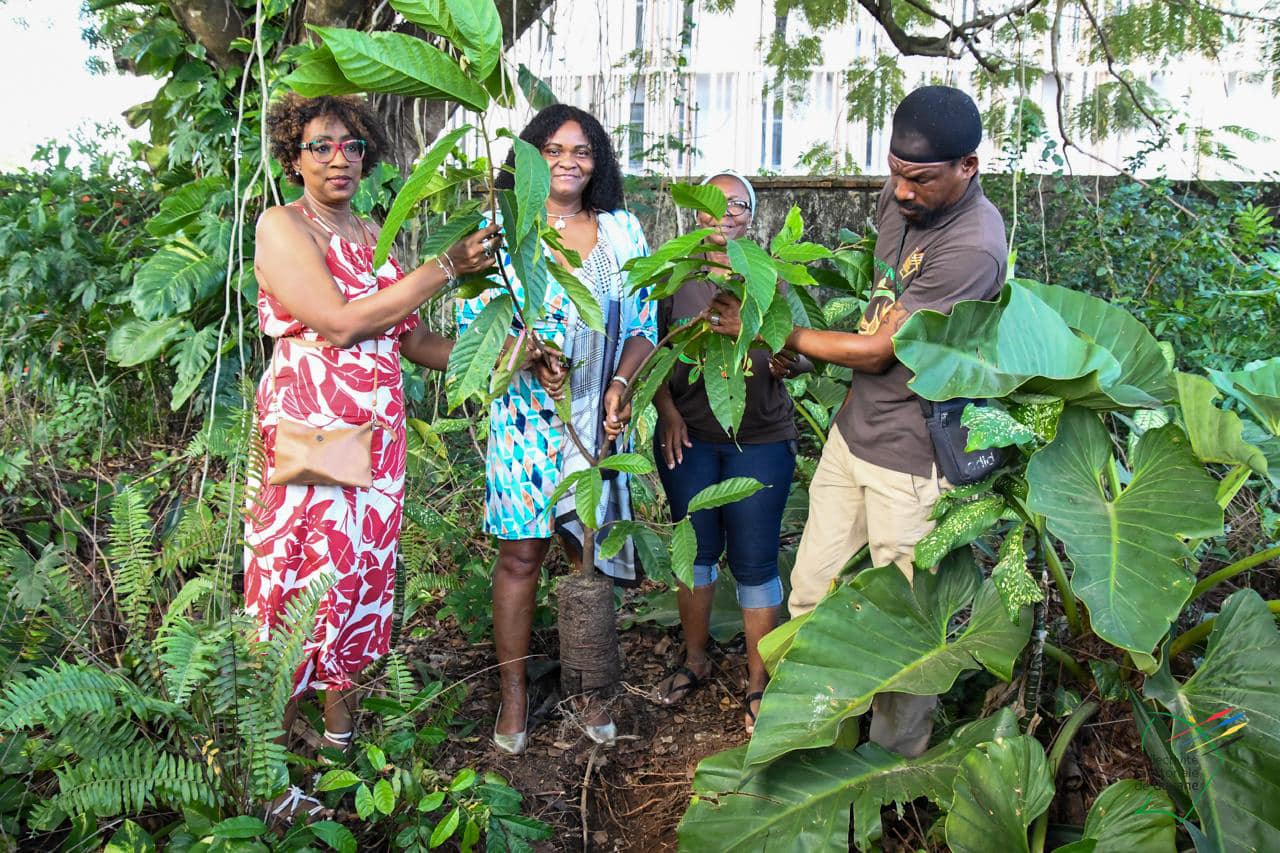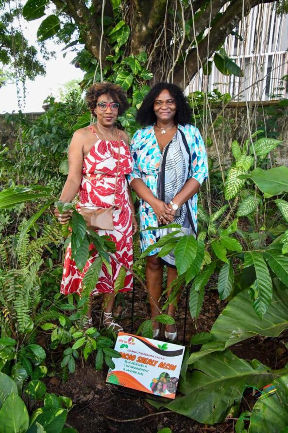 - La mise en terre d’un cacaoyer pour la première fois au jardin botanique, par les élues Christiane Barbe et Sherly Alcin, aux côtés des agents.