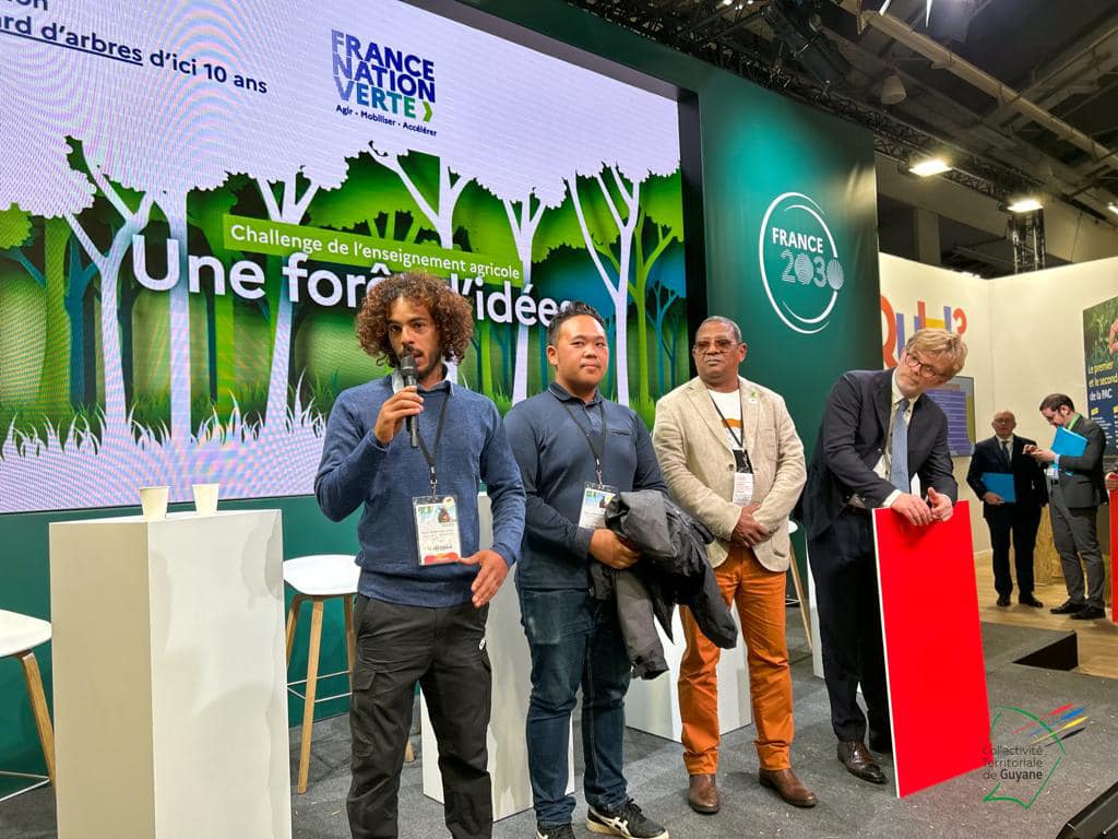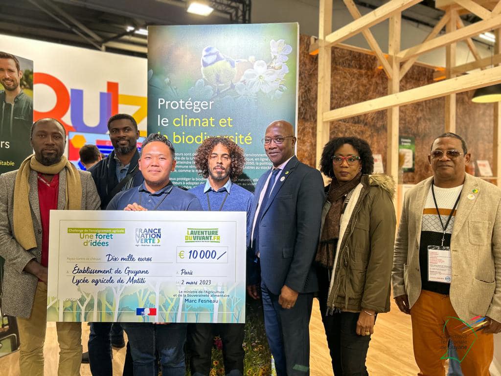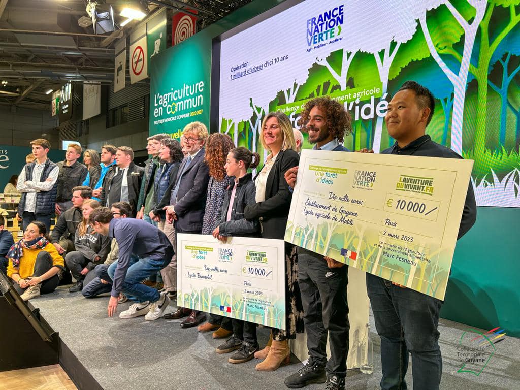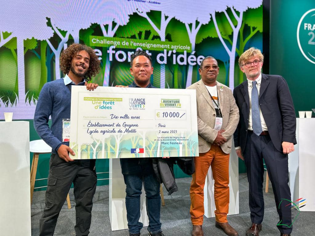 Dimitri Verdure, étudiant en première année de BTS Développement de l’Agriculture en Régions Chaudes (DARC) au lycée agricole de Matiti, et Armand Thao Gai Cheu, en terminale Conduite et Production Horticole (CPH) étaient récompensés, par Marc Fesneau, ministre de l’agriculture et de la souveraineté alimentaire, dans le cadre du challenge pédagogique « Forêt d’idées », du Ministère de l’agriculture relevé par le Lycée Agricole de Matiti, ce jeudi 2 mars 2023.