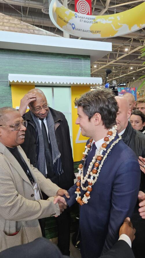 Roger Aron, vice-président délégué à l’agriculture a échangé avec le premier ministre, Gabriel Attal, présent sur le stand de l’Office de Développement de l’Économie Agricole d’Outre-Mer (ODEADOM).