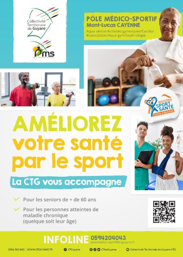 Depuis 2018, la Collectivité Territoriale de Guyane propose sur prescription médicale, du lundi au vendredi, plusieurs activités et un suivi personnalisé à destination des personnes atteintes d’une maladie chronique (sans conditions d’âge) ou des séniors de plus de 60 ans, pour un montant de 20€/ mois à raison de 4h d’activités par semaine selon la durée de la prescription.