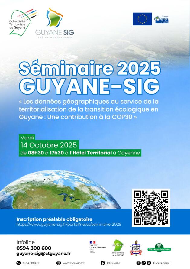 La Collectivité Territoriale de Guyane, en partenariat avec la Préfecture, l’ONF, l’AUDeG et l’UFPA, organise le séminaire annuel de la plateforme territoriale Guyane-SIG,  Mardi 14 octobre 2025, de 8h30 à 17h30, à l’Hôtel Territorial.