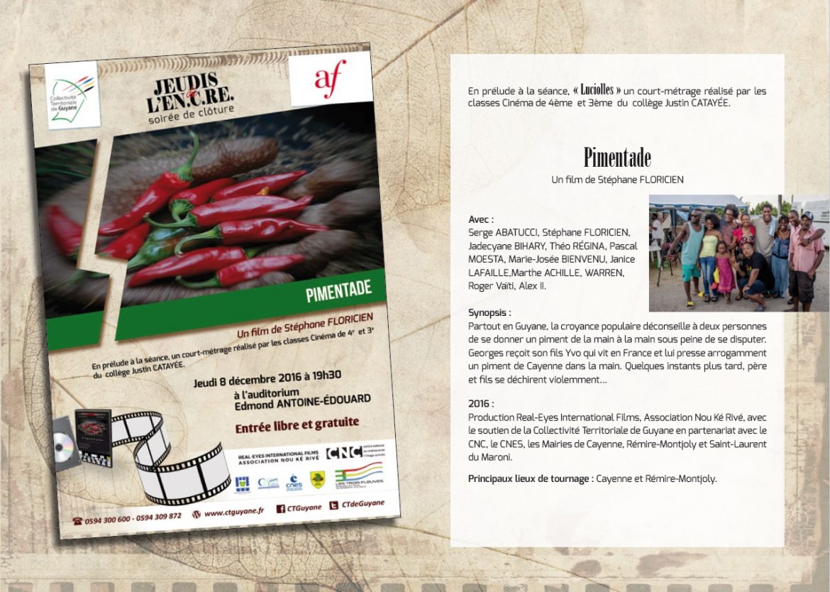 La Collectivité Territoriale de Guyane et L’Alliance Française de Cayenne ont le plaisir de vous convier à l’avant-première du film “Pimentade” réalisé par Stéphane FLORICIEN