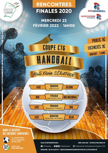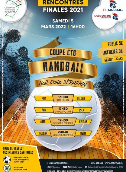 Afin de promouvoir sa politique ambitieuse et répondre aux enjeux sportifs du territoire, la Collectivité Territoriale de Guyane (CTG), en partenariat avec la Ligue Régionale de Handball de Guyane organisent la Finale de la Coupe CTG de Handball (U18 filles et garçons et Séniors filles et garçons) au Hall Kévin Séraphin suivant le programme ci-dessous :