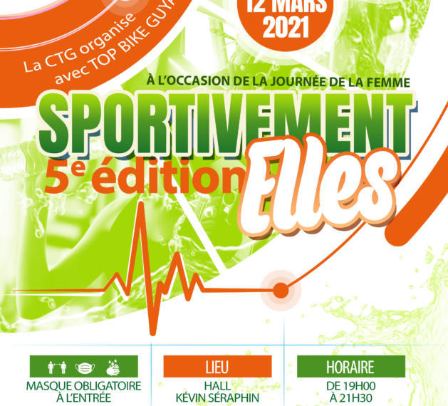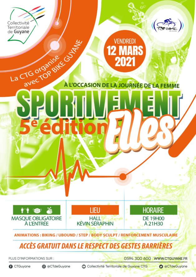 La Collectivité Territoriale de Guyane organise, dans le cadre de la Journée de la Femme, la 5ème édition de la manifestation « Sportivement Elles », en partenariat avec TOP BIKE GUYANE. Le rendez-vous est donné le vendredi 12 mars 2021, de 19h à 21h30, au hall Kévin Séraphin.
