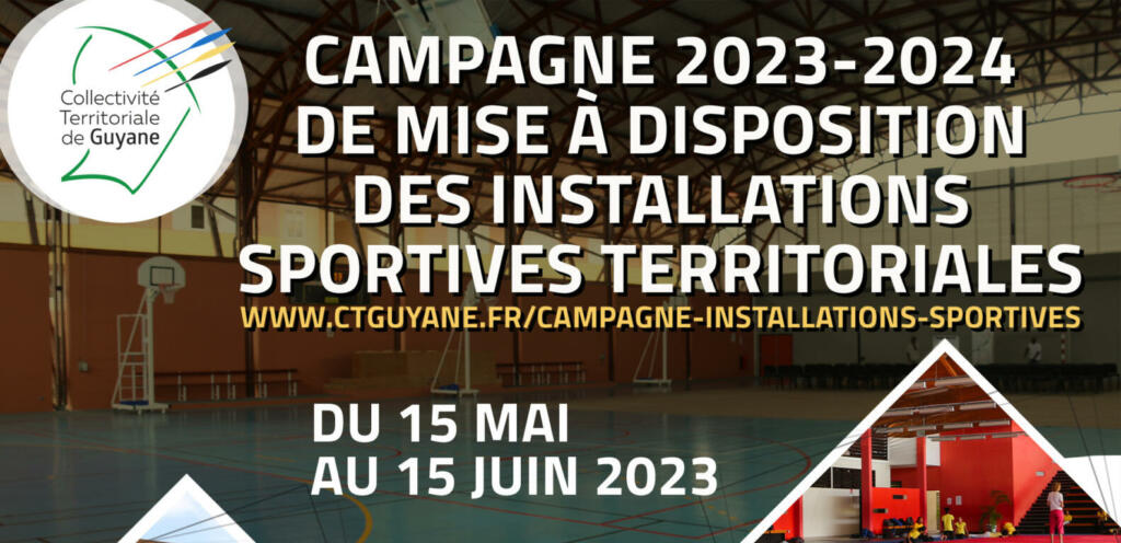 La Collectivité territoriale de Guyane informe l’ensemble des associations et clubs sportifs de Guyane du lancement de la campagne dématérialisée de mise à disposition de ses installations sportives (gymnases, terrains, stades …) du lundi 15 mai au jeudi 15 juin 2023.