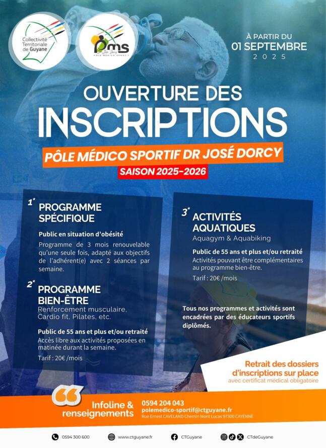 La Collectivité Territoriale de Guyane informe de l’ouverture des inscriptions au Pôle Médico-Sportif (PMS) Dr José Darcy pour la saison 2025-2026.