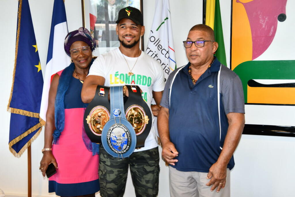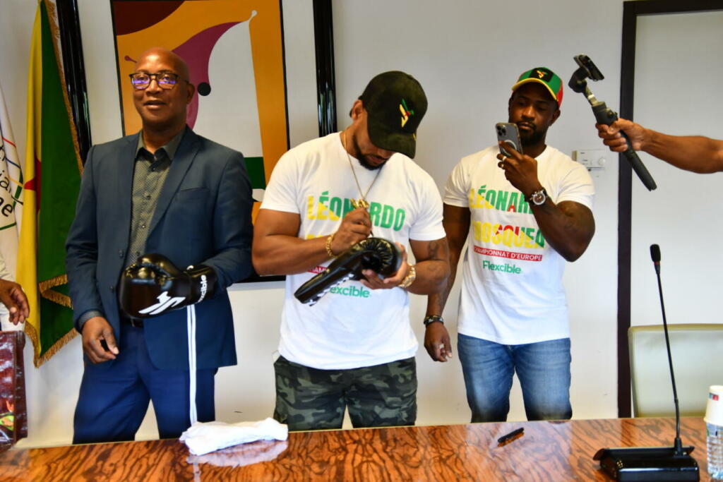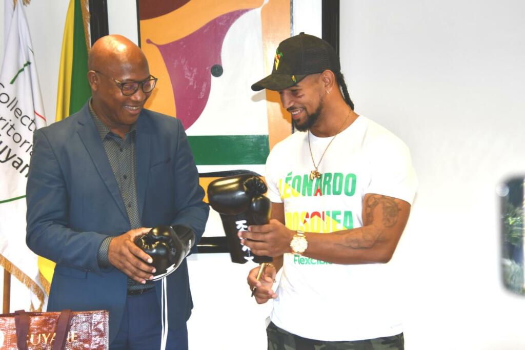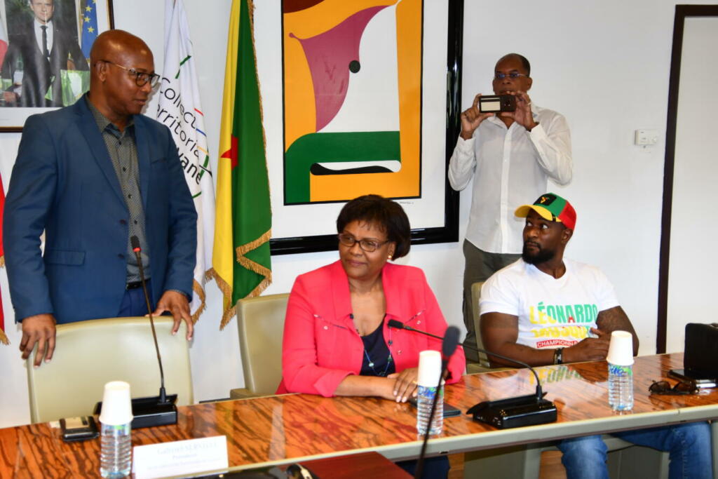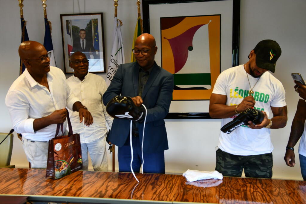 Ce lundi 27 novembre 2023, Gabriel Serville, Président de la Collectivité Territoriale de Guyane (CTG) accompagné de Lucien Alexander, Conseiller Territorial délégué à la Fiscalité et la Performance budgétaire, recevait à l’Hôtel territorial à Cayenne, Léonardo Mosquea Jimenez, sacré Champion de L’Union européenne de boxe des lourds-légers (ceinture EBU Silver), Yoma Jacobin, ancien champion d’Europe de boxe, plusieurs boxeurs amateurs et de nombreux représentants du monde de la boxe, parmi lesquels Romaric Ruper, organisateur de ce gala, le capitaine des “Yana Doko”, Ludovic Baal, Steeve Falgayrettes, entraîneur adjoint, Marcel Bafau, président de la ligue de football de Guyane, Jaqcues Chinon entraîneur de box, pour les féliciter pour leurs exploits sportifs.