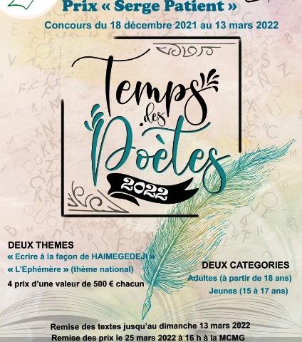 [CULTURE – Le Temps des Poètes] – Le Concours de “Prix de la Poésie Serge Patient” est ouvert jusqu’au 13 mars 2022 et la remise des Prix aura lieu le samedi 26 mars 2022 à 18h00 à l’ENCRE