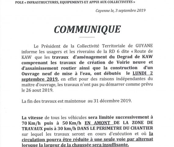 COMMUNIQUÉ : Travaux d’Aménagement du Dégrad de Kaw du 02.09.2019 au 31.12.2019 [MAJ]