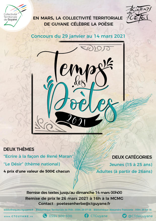 Du 13 au 29 mars 2021, la Collectivité Territoriale de Guyane contribuera à célébrer « Le Temps des Poètes » notamment en mettant à l’honneur le poète, écrivain René MARAN. Dans ce cadre, la CTG lance la 4è édition du concours de poésie “Le Temps des Poètes”, du vendredi 29 janvier au dimanche 14 mars 2021, pour les candidats résidant en Guyane.