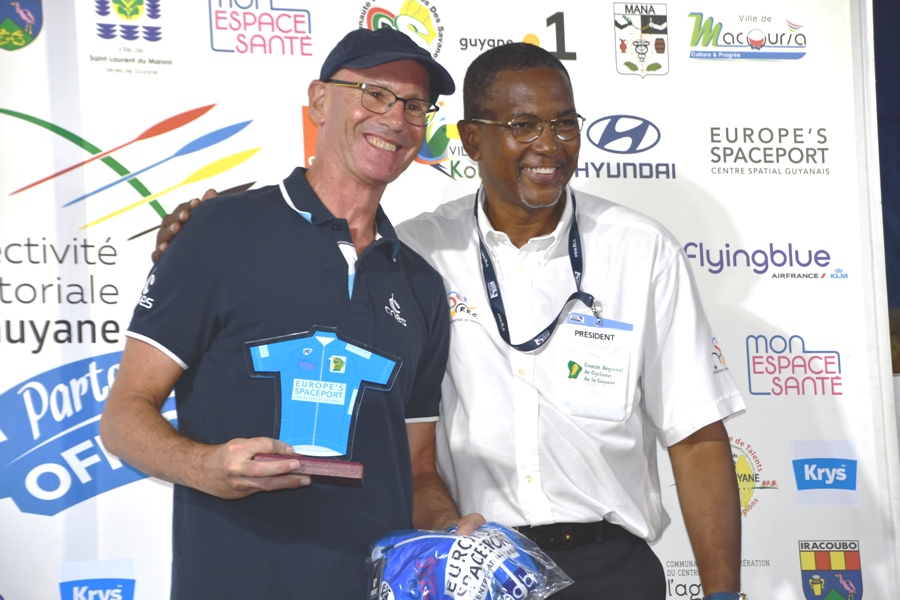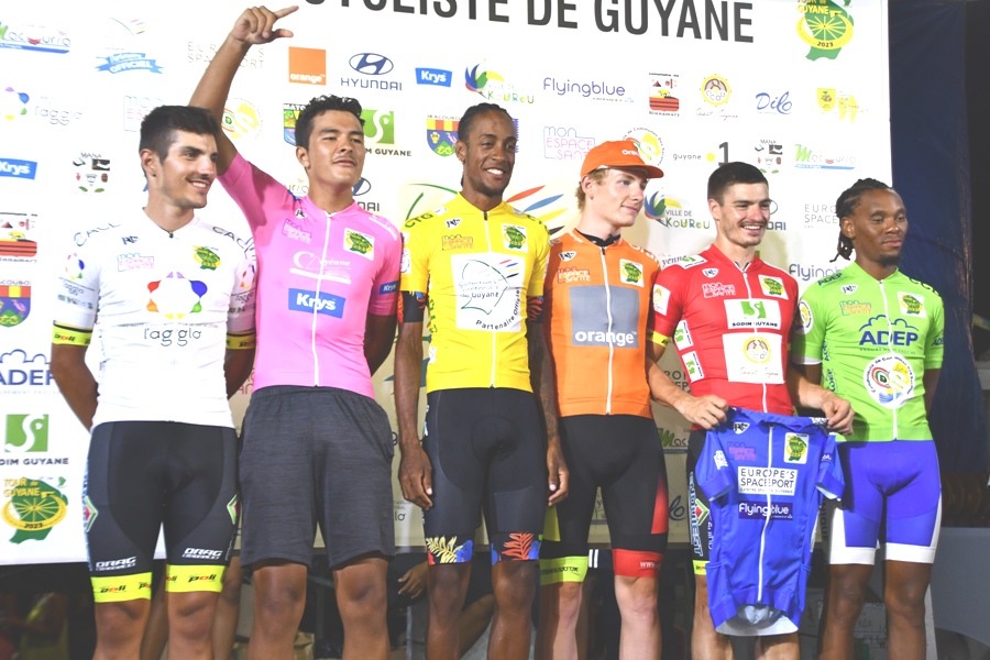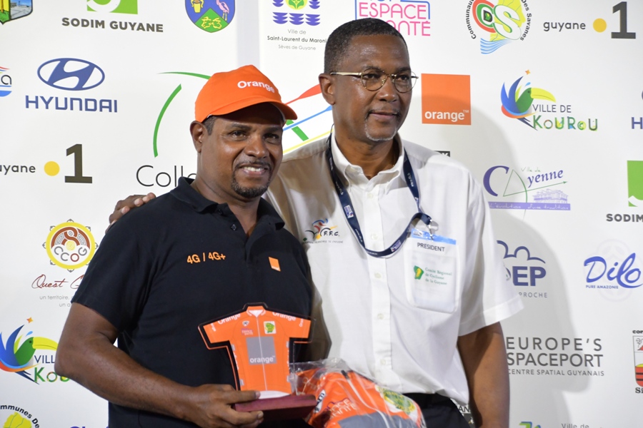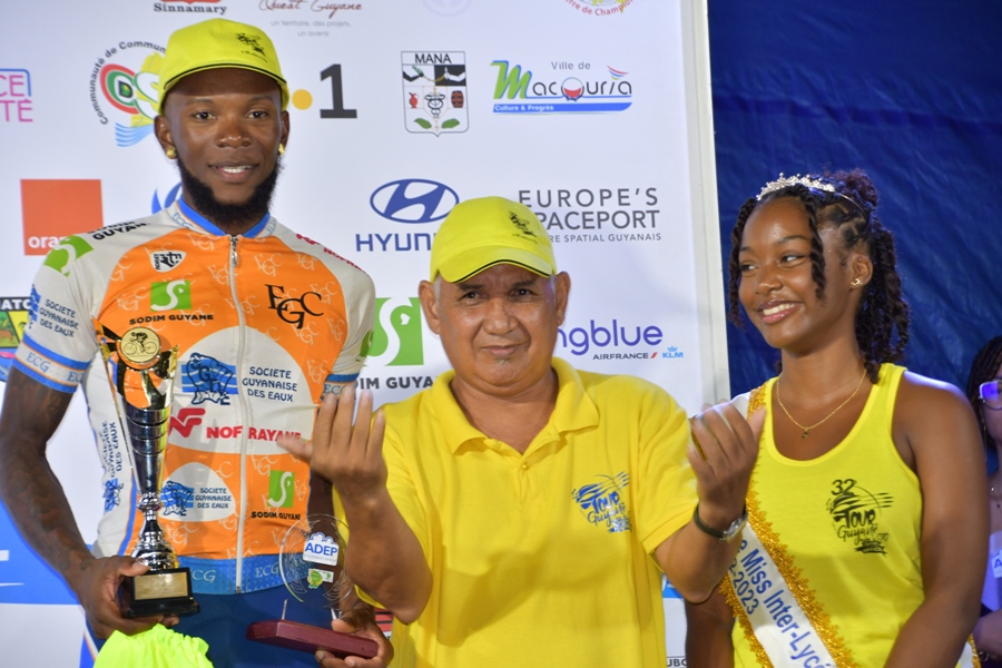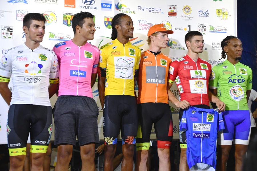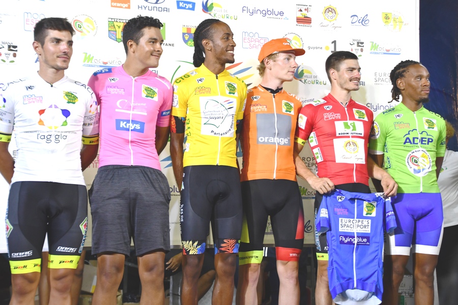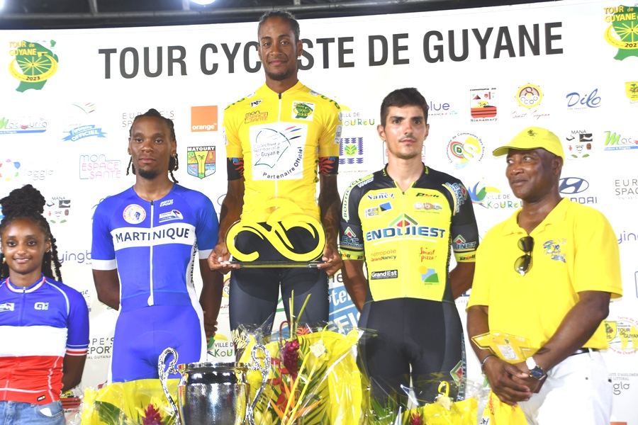 Gabriel Serville, président de la Collectivité Territoriale de Guyane et plusieurs élus territoriaux ont remis le maillot jaune au vainqueur Meving qui devance Edwin Nubul de la Martinique et Emiliano Vila de l’ASPTT Nancy, en présence de Jean-Yves Thiver, Président du Comité Régional Cycliste de Guyane, de Sandra Trochimara, maire de la Ville de Cayenne, de partenaires institutionnels et de nombreux adeptes.