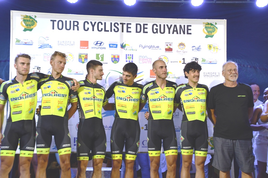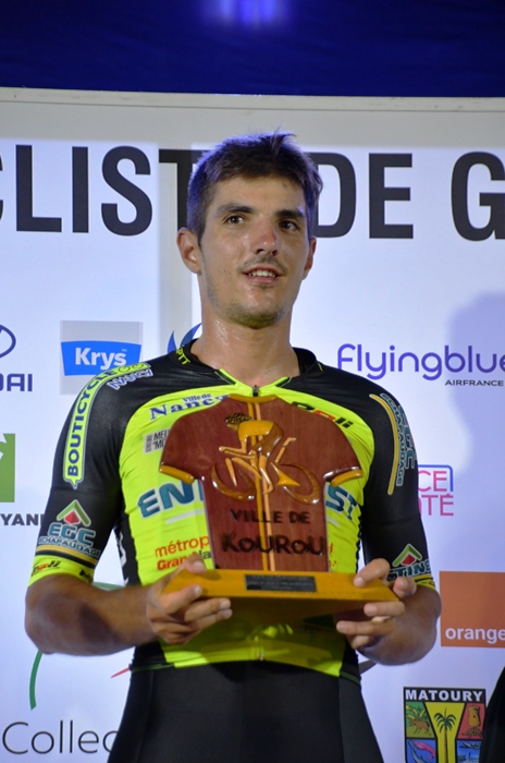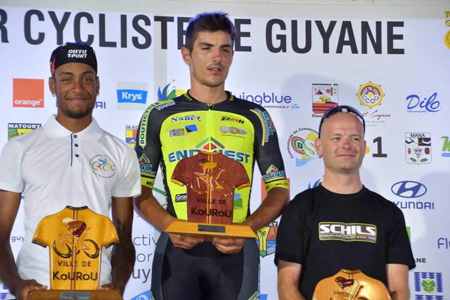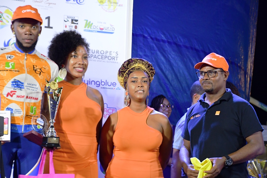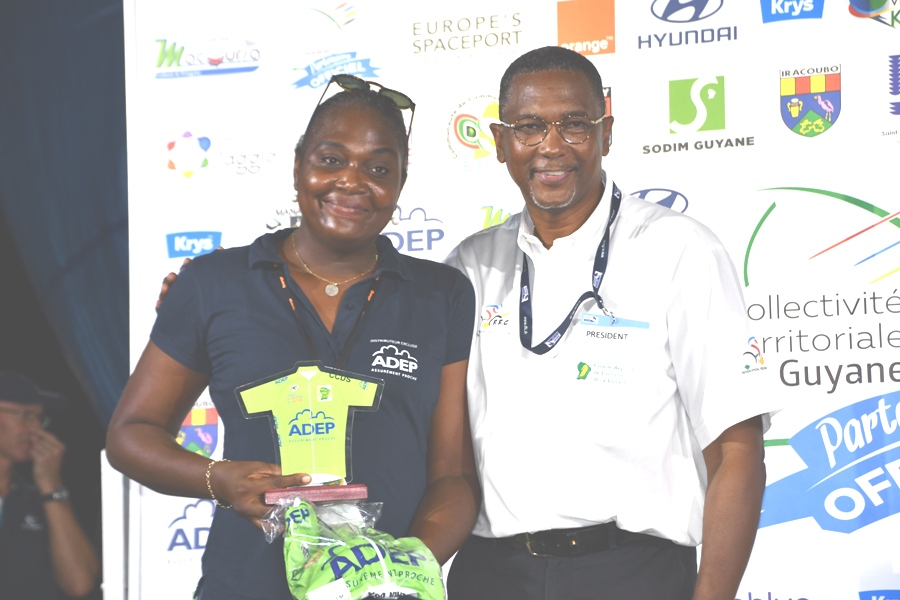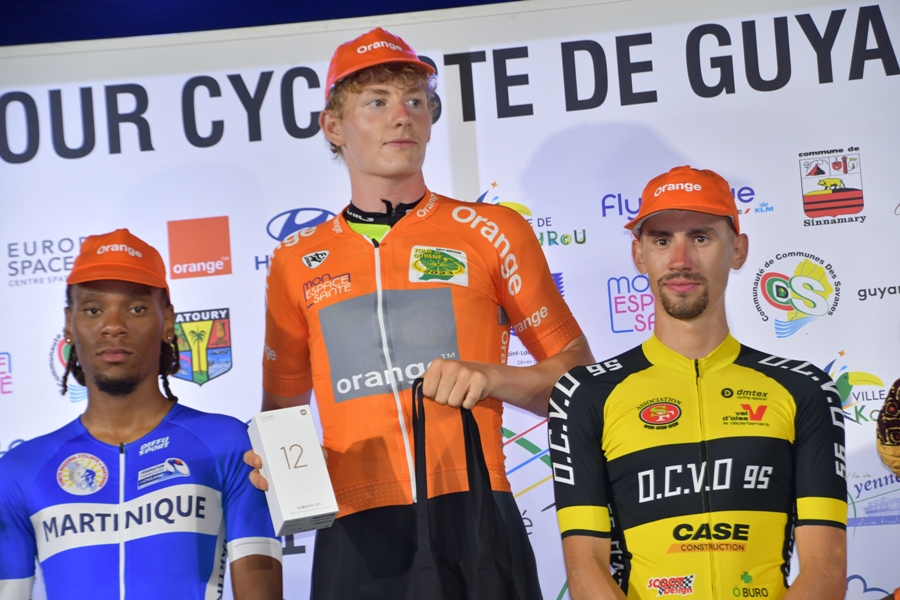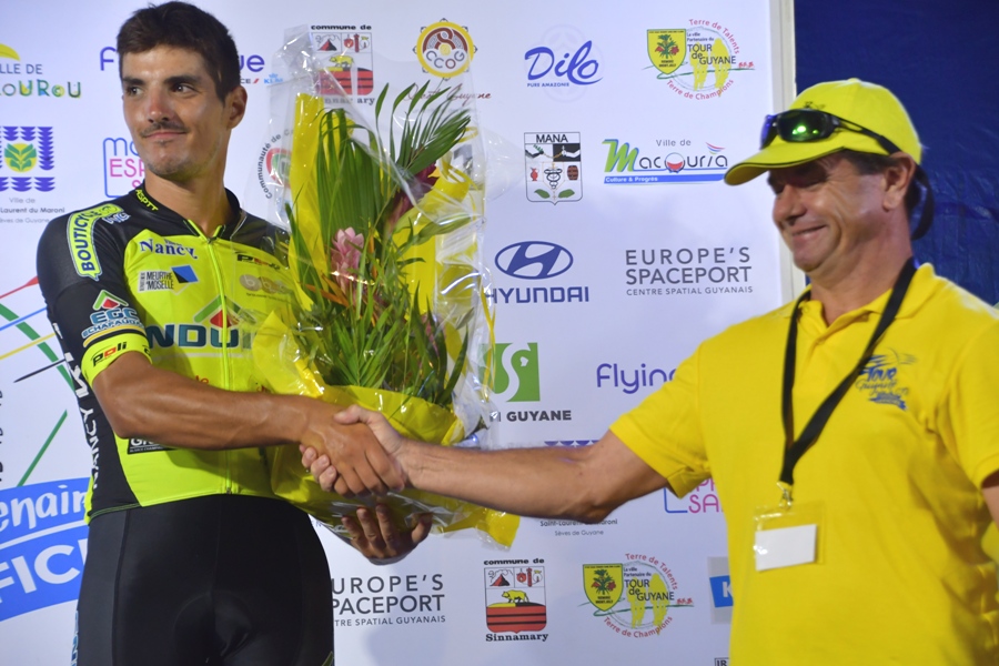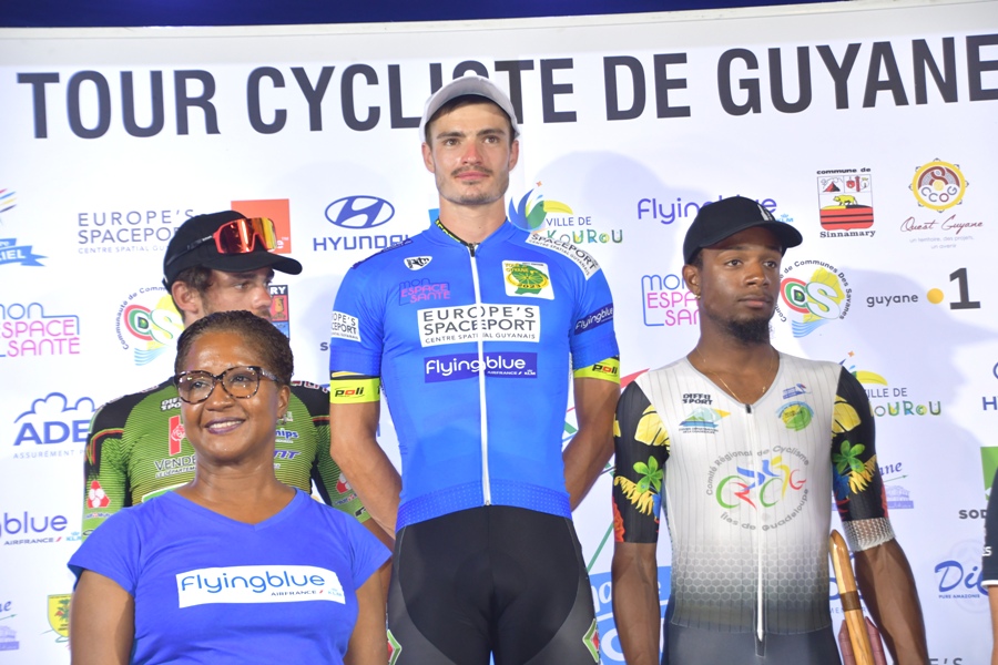 Gabriel Serville, président de la Collectivité Territoriale de Guyane et plusieurs élus territoriaux ont remis le maillot jaune au vainqueur Meving qui devance Edwin Nubul de la Martinique et Emiliano Vila de l’ASPTT Nancy, en présence de Jean-Yves Thiver, Président du Comité Régional Cycliste de Guyane, de Sandra Trochimara, maire de la Ville de Cayenne, de partenaires institutionnels et de nombreux adeptes.