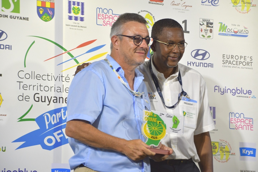 Lors de cette cérémonie qui se déroulait devant l’Hôtel Territorial, Gabriel Serville a salué les coureurs locaux, notamment William Doxiant du Vélo Club Guyanais qui a offert à la Guyane une victoire d’étape avec la complicité de Maurice Nascimento Buzaré de Sinnamary, mais également Jocelyn Achille pour sa ténacité, et Marc Talane de Mixte FRA pour son courage, malgré son abandon.