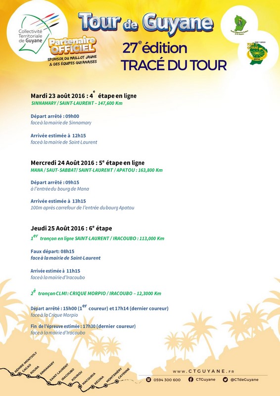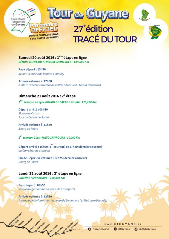 Pour la première année de son existence, la Collectivité Territoriale de Guyane, par la voix de son Président Rodolphe Alexandre, a tenu à poursuivre les partenariats qui existaient entre le Comité Régional de Cyclisme de la Guyane, organisateur, et les deux anciennes collectivités, le Conseil Général de Guyane et la Région Guyane, en tenant compte du contexte actuel de compression budgétaire. Néanmoins, la Collectivité Territoriale de Guyane se positionne comme un maillon essentiel de ce Tour 2016 : partenaire officiel, sponsor du maillot jaune, accompagnatrice financière des équipes guyanaises… le tout dans un emballage permettant d’animer cette manifestation à la hauteur des attentes des coureurs et des spectateurs : subvention à Guyane 1ère permettant la retransmission radio et télé de l’événement, soirée de présentation des équipes au Zéphyr, véhicule du maillot jaune au sein de la caravane du Tour, goodies pour les supporters, stand à l’arrivée, trophées chaque jour pour le maillot jaune, prise en charge de journalistes de France héxagonale pour le rayonnement national (Tropiques FM et France Ô) etc… : l’implication de la CTG est sans faille.