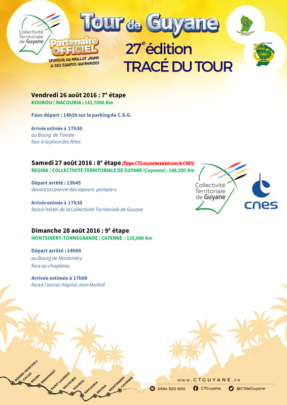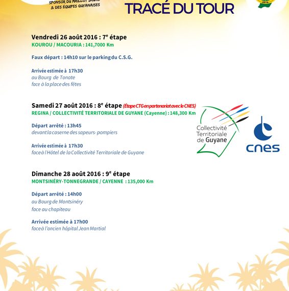 Enfin, un autre point primordial est également à retenir : la très importante étape du samedi 27 août 2016, étape CTG en partenariat avec le CNES, qui partira de Régina pour relier l’Hôtel Territorial à Suzini… Sur place à l’arrivée, dès 16h, avant même la remise des prix : animations, ambiance musicale, jeux, stands… C’est un programme complet pour toute la famille qui vous attendra.
