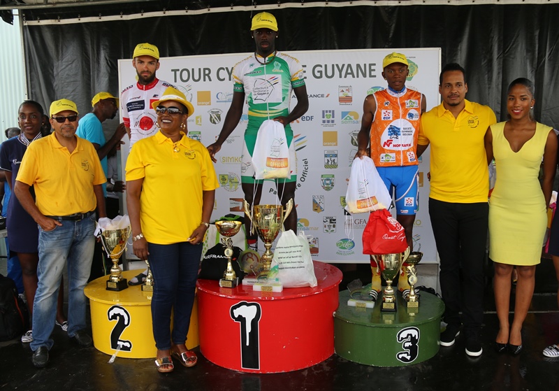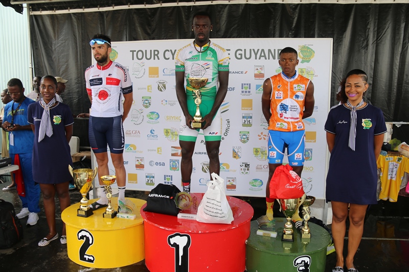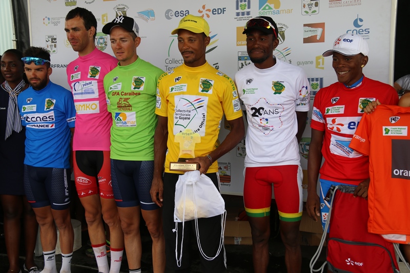 C’est au bout d’efforts acharnés que James Grinville s’est imposé au sprint sur la lignée d’arrivée, devançant de peu Ludovic Bideau, de l’équipe Centre Nord, et Terry Tsang Yee Moï de l’Espoir Cycliste Guyanais, toujours détenteur du maillot rouge (points chauds), mais également du maillot bleu (combativité). James Grinville a ainsi eu le plaisir de se voir remettre de nombreuses récompenses, parmi lesquelles le trophée de l’étape de la Collectivité Territoriale de Guyane, partenaire officiel de la compétition, trophée remis par les Conseillers territoriaux, Nadine Léo, Hadj Boucheida et Jehan-Olivier Maignien.