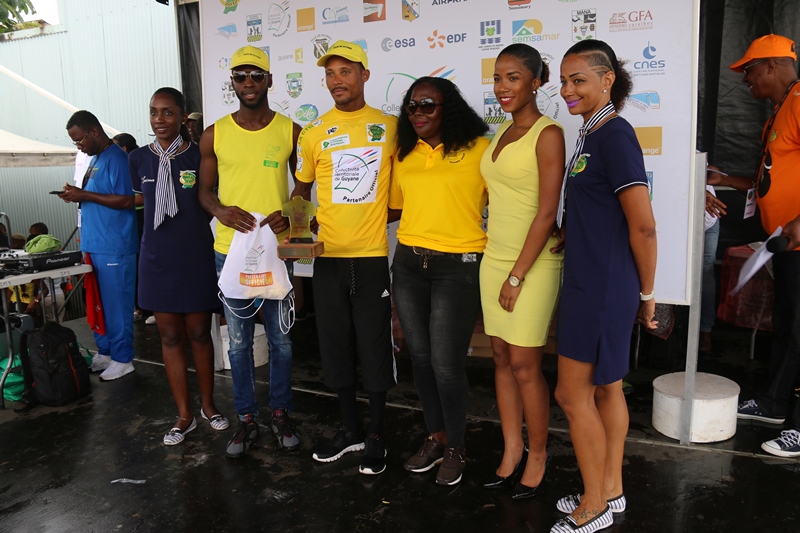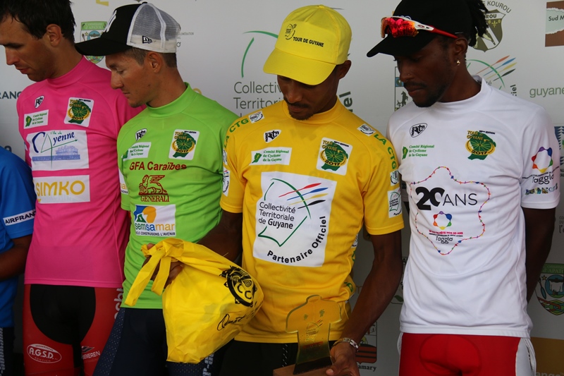 Au classement général, Boris Carène conserve son maillot jaune. La précieuse tunique lui a été remise par la 13 ème Vice-présidente de la Collectivité Territoriale de Guyane, Diana Jojé Pansa, déléguée à la coopération transfrontalière avec le Suriname et le Conseiller Territorial, Lénaïck Adam.
