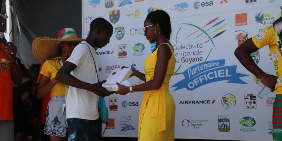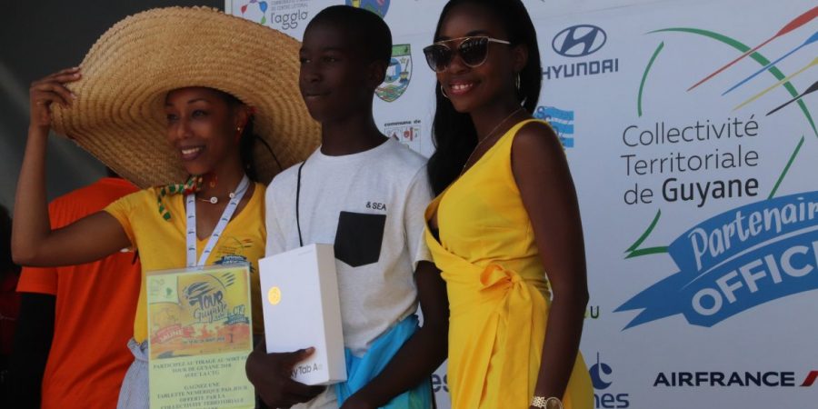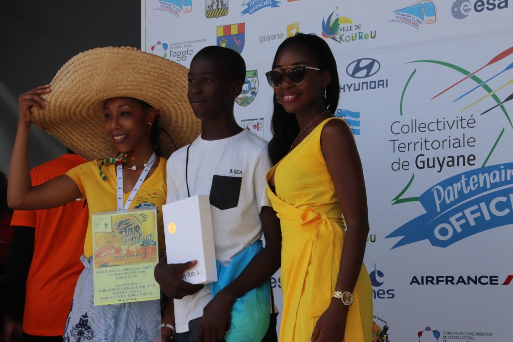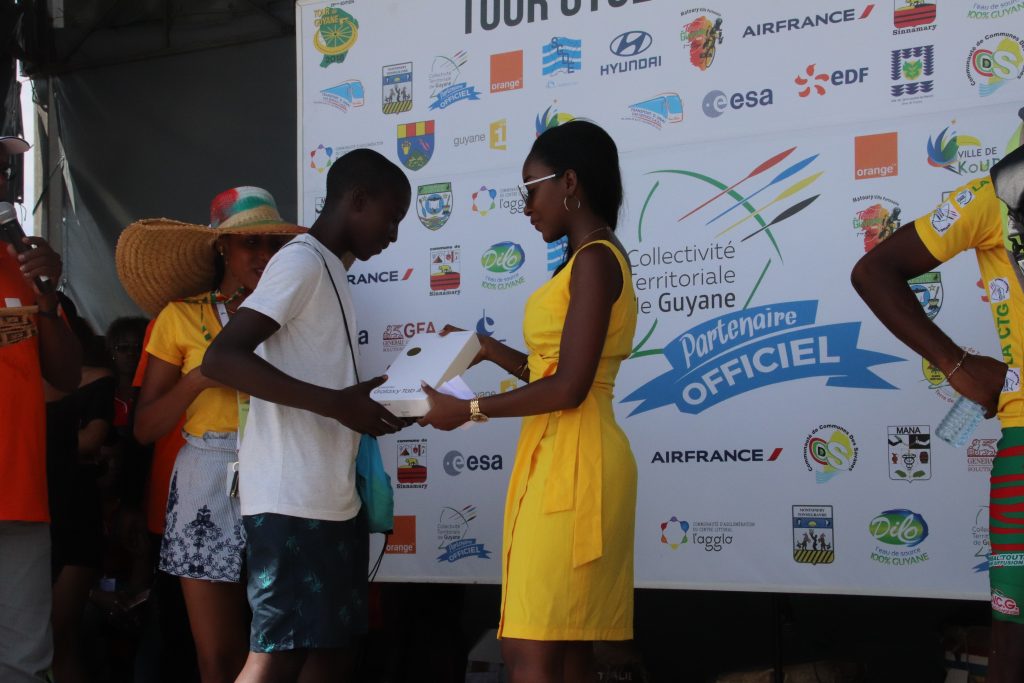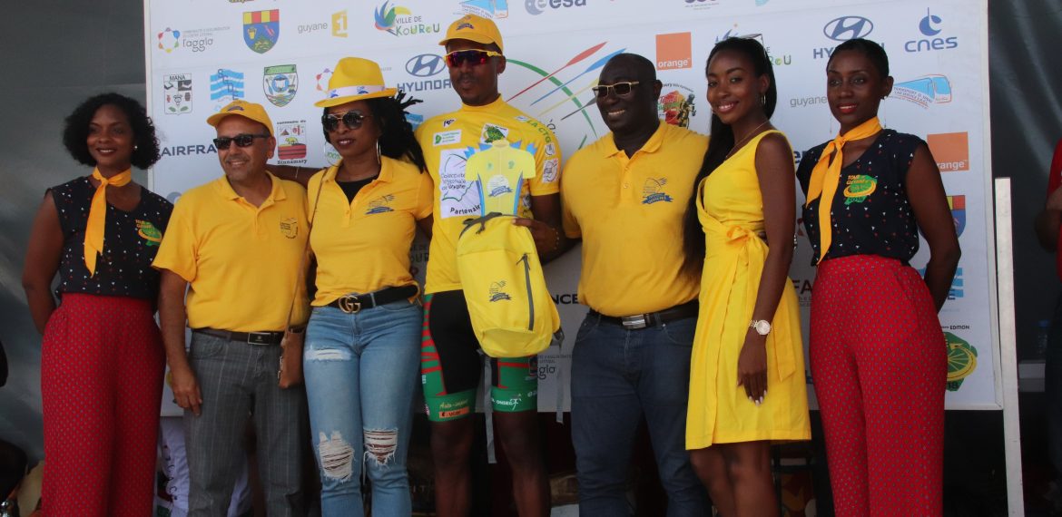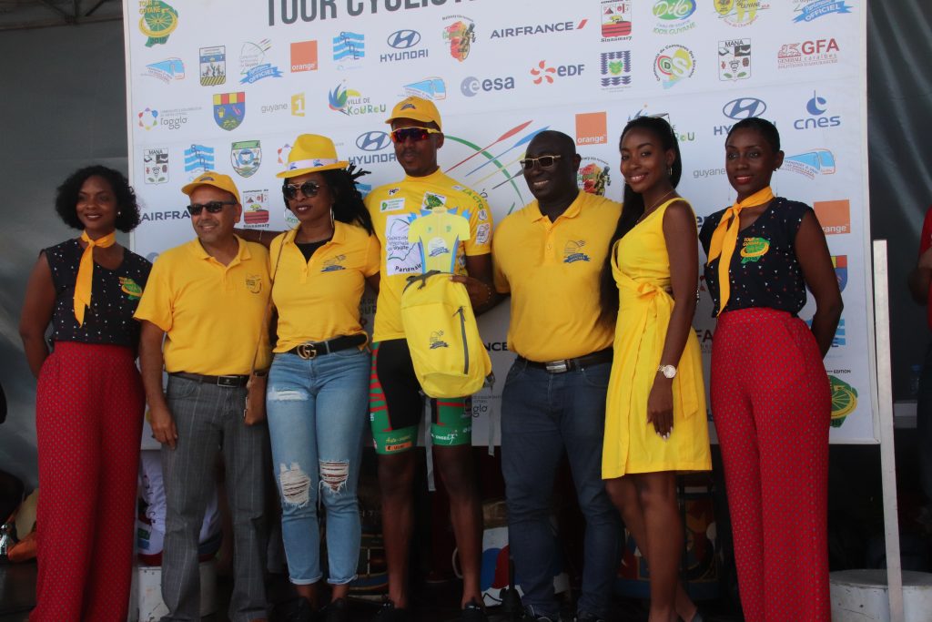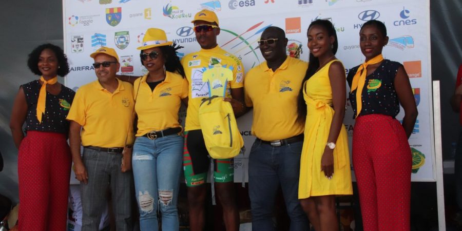 La tunique jaune, sponsorisée par la CTG a été remise au cycliste guyanais pas les élus de collectivité : Denis Galimot, Laurietta Desmangles et Hadj Boucheida.
