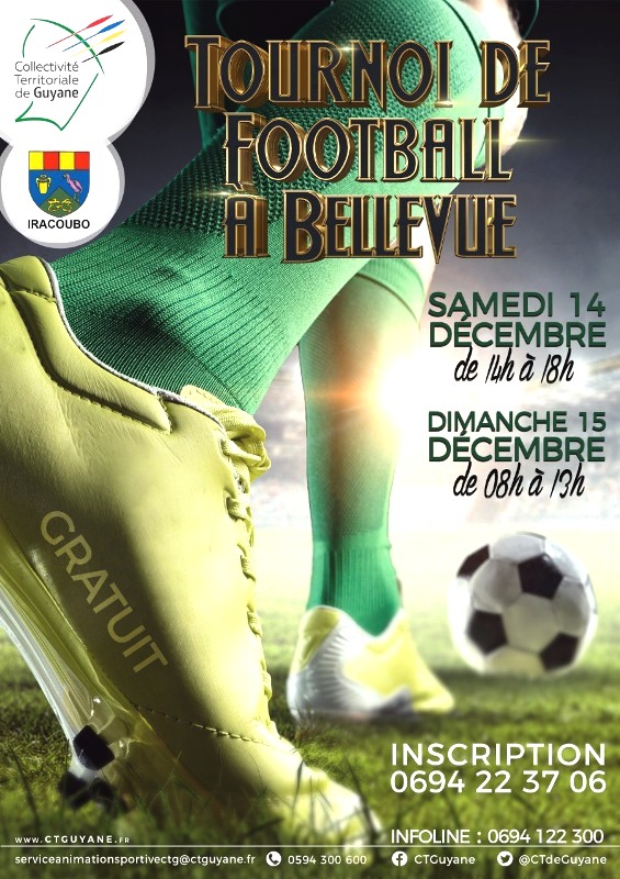 A ce titre, la Collectivité Territoriale de Guyane organise un tournoi de football durant deux jours, réservé exclusivement aux adolescents et aux adultes, le samedi 14 décembre 2019 de 14h00 à 18h00 et le dimanche 15 décembre 2019 de 08h00 à 13h00 (pour la grande finale), au Village Bellevue d’Iracoubo, en partenariat avec la Commune d’Iracoubo.
