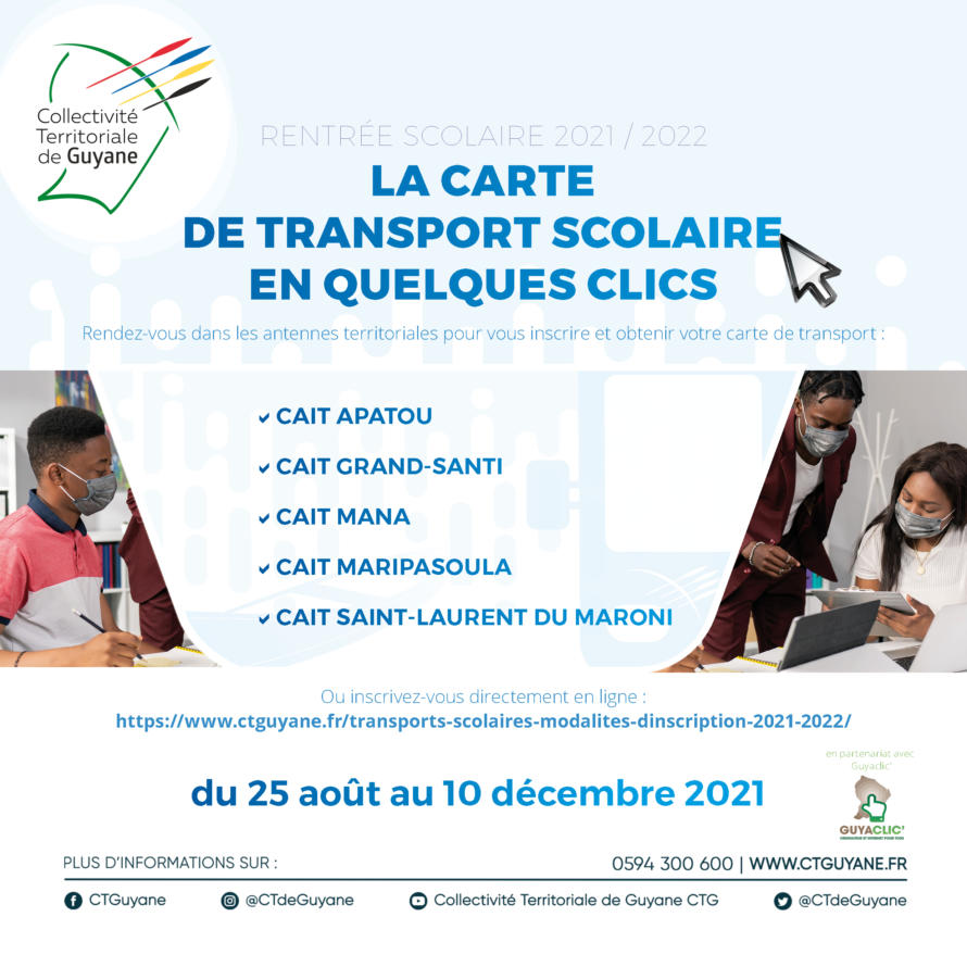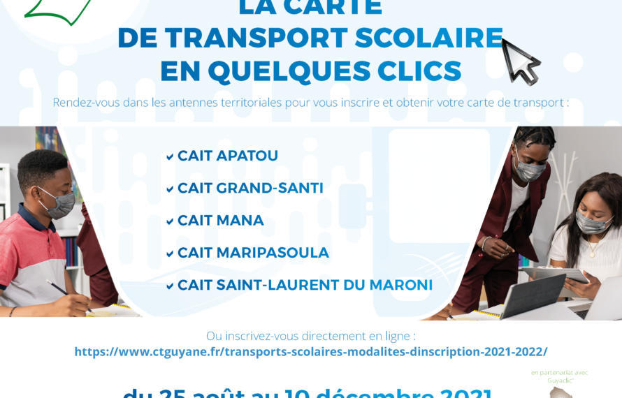 Afin de faciliter le transport de tous les élèves et étudiants sur le territoire et d’optimiser le traitement des demandes de titres de transports, la Collectivité Territoriale de Guyane (CTG), autorité organisatrice de transports, a mis en place au 01er juillet 2021 un outil numérique permettant d’effectuer directement en ligne les inscriptions au transport scolaire.