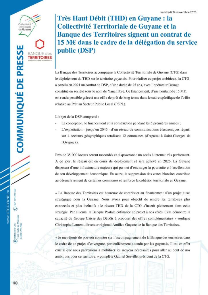 Communiqué signature d'un contrat de 15M € pour le Très Haut Débit en Guyane