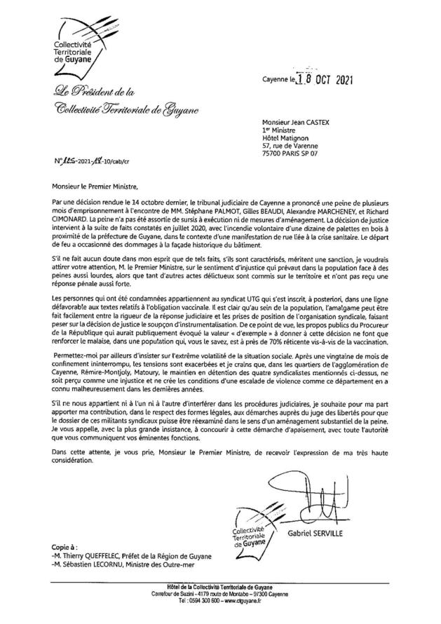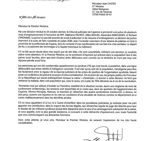 Permettez-moi par ailleurs d’insister sur l’extrême volatilité de la situation sociale. Après une vingtaine de mois de confinement ininterrompu, les tensions sont exacerbées et je crains que, dans les quartiers de l’agglomération de Cayenne, Rémire-Montjoly, Matoury, le maintien en détention des quatre syndicalistes mentionnés ci-dessus, ne soit perçu comme une injustice et ne crée les conditions d’une escalade de violence comme ce département en a connu malheureusement dans les dernières années.