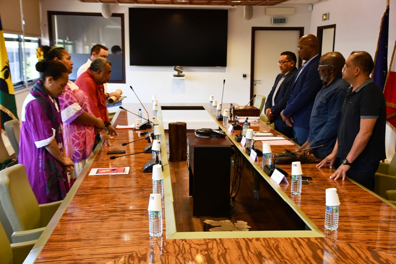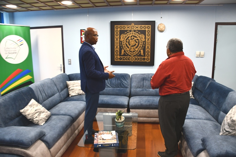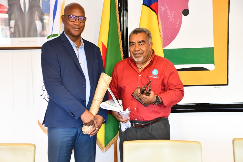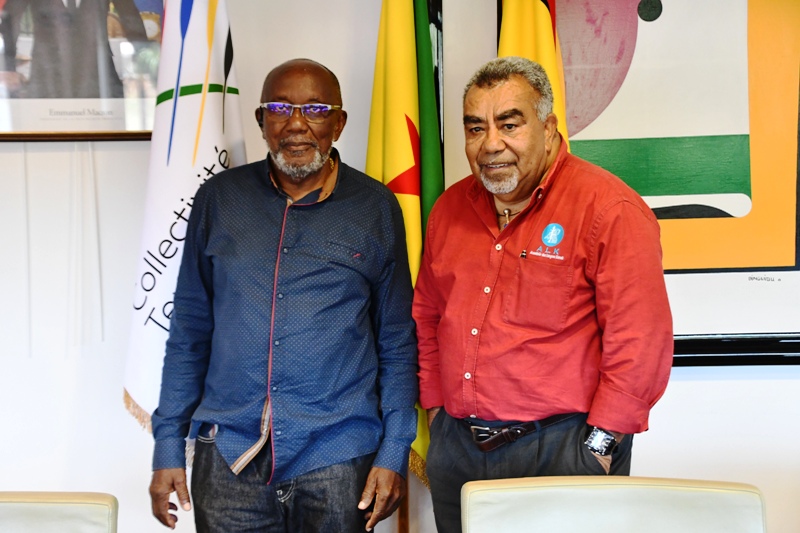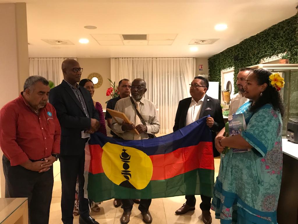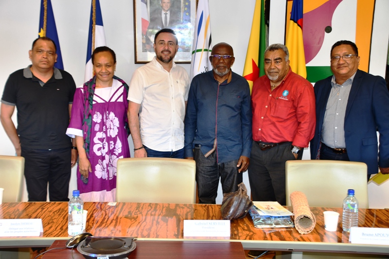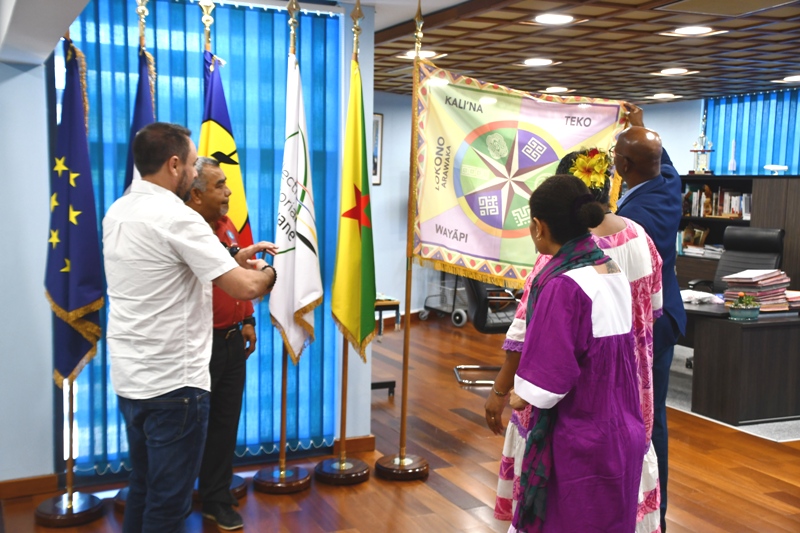 La délégation composée de Laurie Humuni, présidente du Conseil d’Administration de l’Académie des Langues Kanak, Weniko Ihage, directeur de l’Académie des Langues Kanak, Olivier Fandos, coordonnateur du service de l’enseignement des langues Kanak du vice-rectorat de la Nouvelle Calédonie et Annick Kasovimoin, coordinatrice des actions linguistiques et culturelles de l’Académie des langues Kanak a ainsi échangé avec Gabriel Serville, président de la Collectivité Territoriale de Guyane (CTG), Bruno Apouyou, et Sylvio Van Der Pijl, respectivement président et vice-président du Grand Conseil Coutumier, et Jocelyn Thérèse, conseiller territorial, délégué aux relations avec les Peuples Autochtones. Ce partage d’expérience sur la préservation et la valorisation des langues régionales comme marqueur identitaire, ouvre des perspectives sur la création d’une Académie des Langues de Guyane.