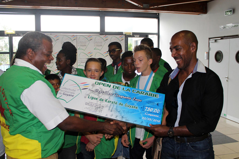 Jean-Claude LABRADOR, a salué le travail effectué et la performance obtenue. Il a reçu une veste aux couleurs de l’équipe de karaté ainsi qu’une pour le Président Rodolphe ALEXANDRE. Puis a remis à la ligue un chèque de 750.00€ en récompense des résultats obtenus.