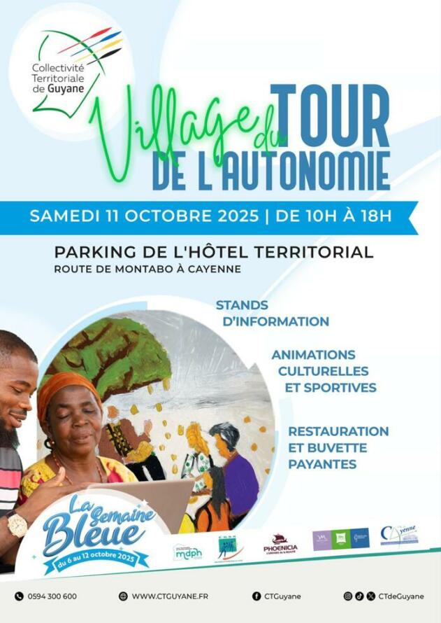 Dans le cadre de la Semaine Bleue organisée par la Collectivité Territoriale de Guyane, du 06 au 12 octobre 2025, le parking de la CTG accueillera le village “Tour de l’Autonomie”, le 11 octobre de 10h à 18h.